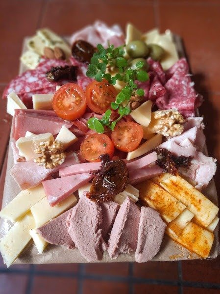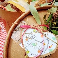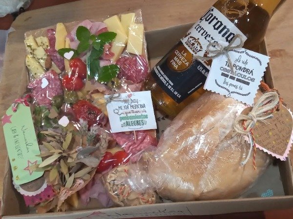 Picada para una persona. Variedad de fiambres y quesos de primera calidad, olivas, frutos secos, tomates secos hidratados en aceite de oliva, bebida a elección, maní, un pan de campo. Deco y tarjeta "para Mamá". Ramito de flores secas.