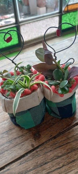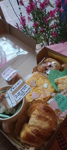 Medialuna con jamón y queso. Rollo de canela, cacao y chocolate. Incluye mini macetita o corazón de alambre artesanal. Deco alusiva a la fecha, tarjeta.