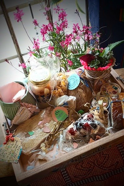 Bandeja de madera decorada artesanalmente, con maceta artesanal "mini jardín". Con tarjetas y etiquetas personalizadas hechas a mano. Incluye taza de cerámica artesanal. productos de elaboración casera, preparados en el momento, sin conservantes ni aditivos industriales:infusión a elección lista para consumir , scons de queso, sandwich tostado, torta casera, budín casero, frasco de yogur con frutas y granola, pan de campo ,dips de queso crema y mermelada agroecológica. Incluye porta celular amplificador de madera maciza artesanal, maceta artesanal con suculenta o mini jardín o corazón de alambre artesanal con base de madera.