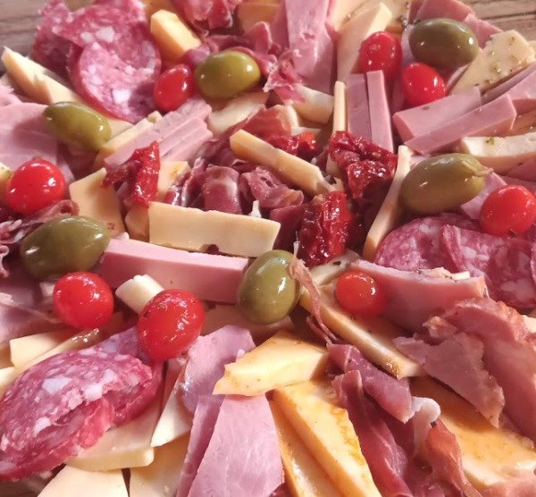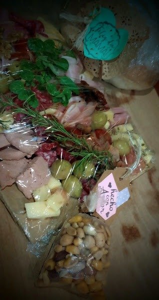 Picada para una persona. Variedad de fiambres y quesos de primera calidad, olivas, frutos secos, tomates secos hidratados en aceite de oliva, bebida a elección, maní, un pan de campo. Deco y tarjeta "para Mamá". Ramito de flores secas.